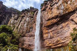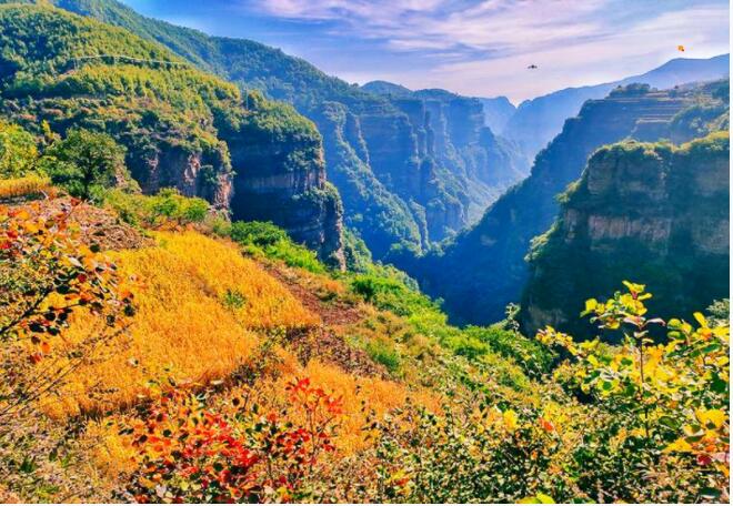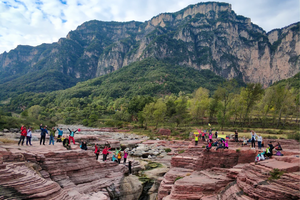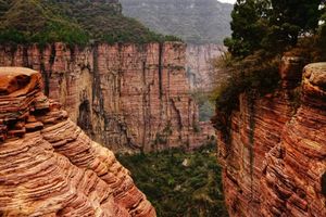- 抱犊大峡谷上方是老龙口一个网红之地,被称为中国的羚羊谷,这里红色石英岩绝冠太行,太行山在这里突然断裂下去,形成一个落差近300米,长上百公里的断裂带,成片的红色石英岩,经过千万年水流侵蚀和风化,在断崖上开了一个大裂口,雨季上游的来水通过裂口呼啸而下。