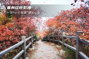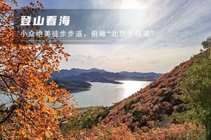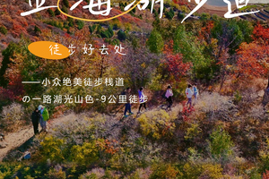 漫山红叶衬着金海湖的碧波,十分养眼。黄栌是金海湖北山步道的一大看点,春天嫩黄,夏天粉红,秋天则变身绚烂的红叶。金海湖步道没那么规整,也没那么气派。好在金海湖的景色很美,足以弥补这小小的缺陷。