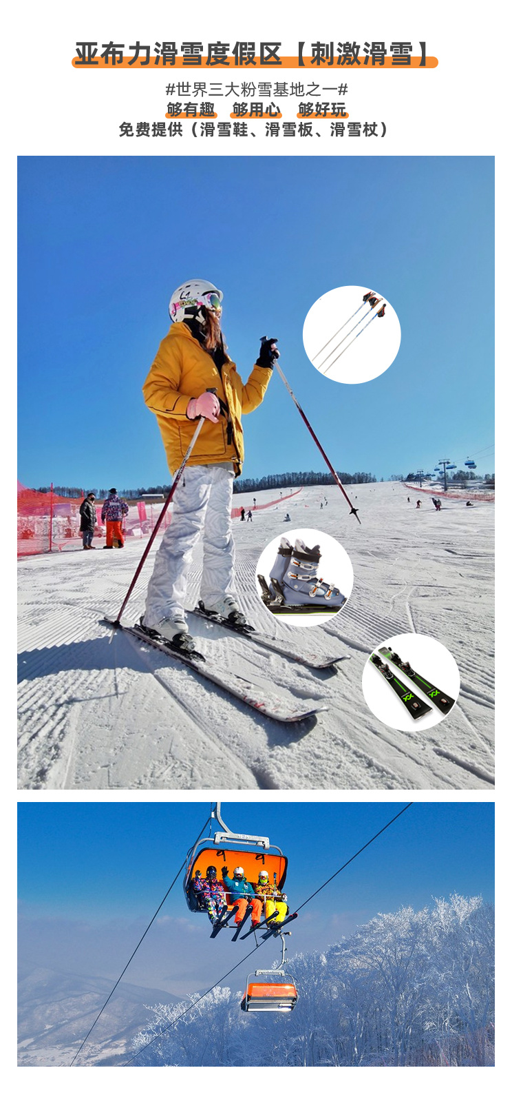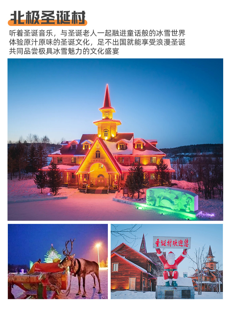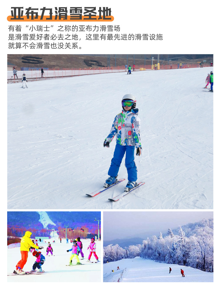 5、全程门票费:亚布力初级滑雪3小时(包含雪板、雪鞋、雪仗)、雪乡门票+景交车、北极村门票、圣诞村门票、龙江第一湾+乌苏里浅滩门票、驯鹿苑门票