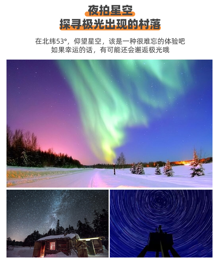 若幸运看到极光降临,绿色光带会在夜空中跳起梦幻芭蕾(注:极光为特殊自然现象,需结合天气、磁暴指数等多重因素,并非每日都有,请您怀揣一份平常心期待。)