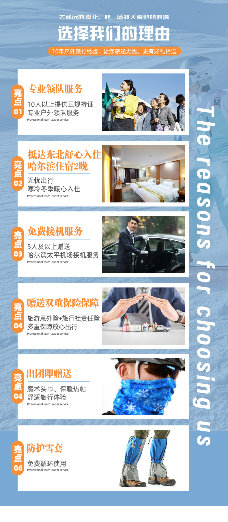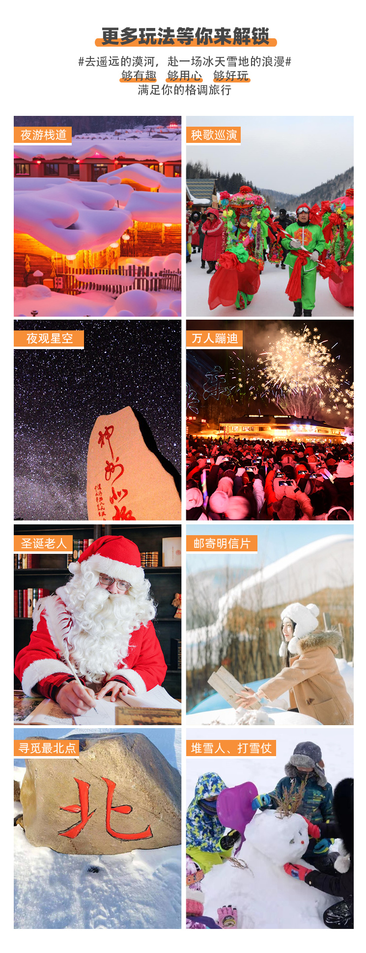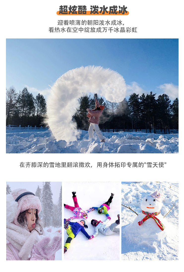 备注:马拉爬犁每年12月下旬至2月下旬冰面厚度达到安全标准后赠送;赠送项目因天气、交通、政策等非人为原因或游客自身原因不体验,导致赠送项目无法赠送体验的,不退费。