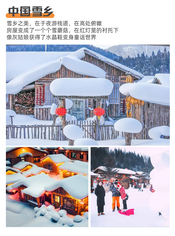 闯入【雪乡】就像跌进圣诞老人的手作村庄!圆滚滚的雪蘑菇房顶着奶油般的积雪,红灯笼在屋檐下摇出一串光晕。先漫步【棒槌山栈道】,俯瞰整个童话小镇被夕阳染成蜜糖色;再逛【雪韵大街】,冻柿子糖葫芦在玻璃柜里闪着光】。等到锣鼓声起,跟着【秧歌巡演】队伍扭起来,红绸飞舞中您也是这冬日盛宴的一部分!