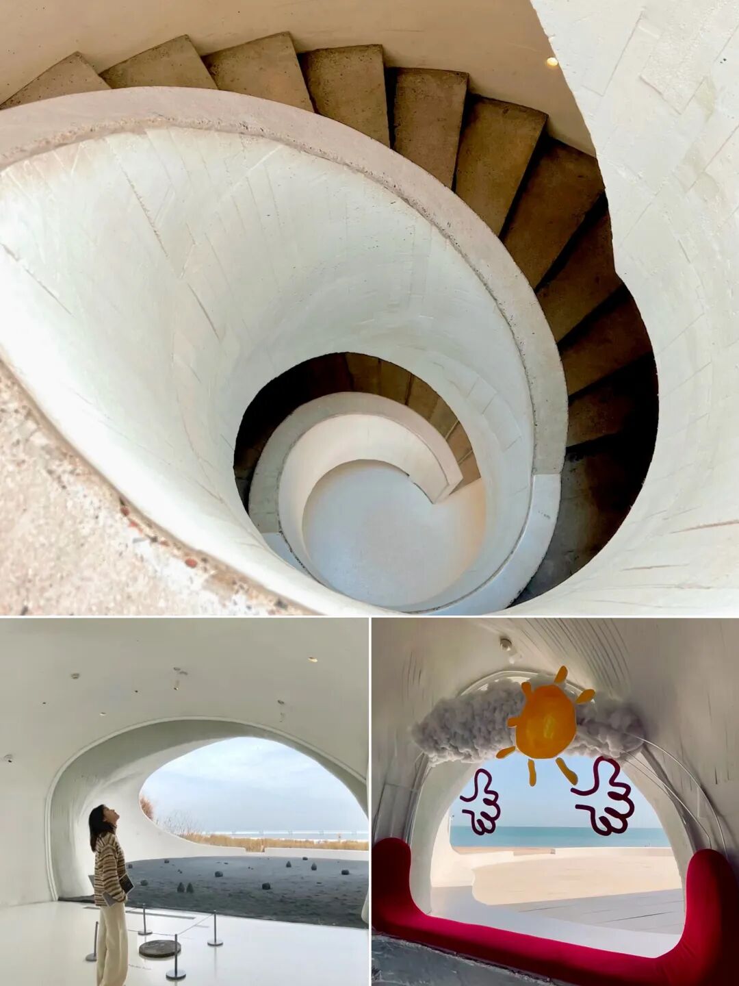 UCCA沙丘美术馆这座异形的白色洞穴建筑与蔚蓝海岸完美融合,纯静又神秘,馆内展览作品水准都较高,值得一看,里面还匿藏着阿那亚海岸线的最佳观景位哦工~