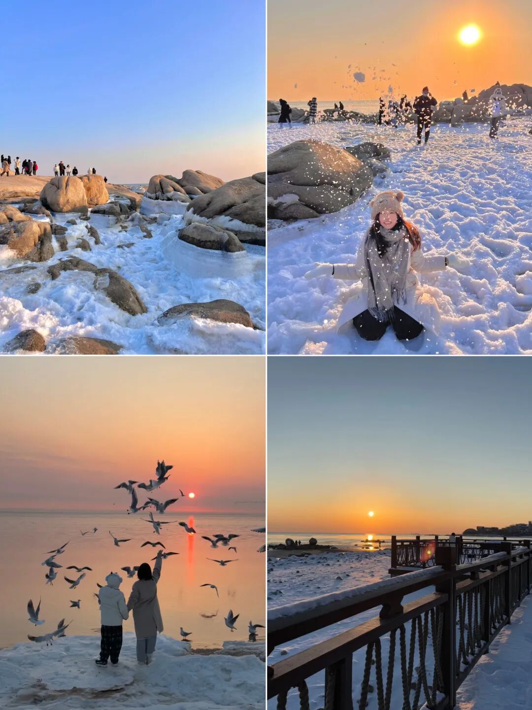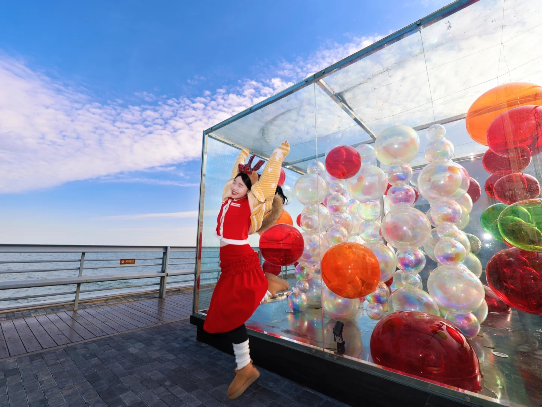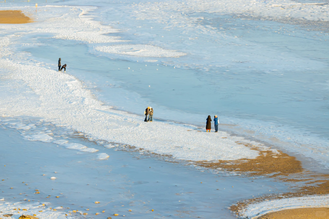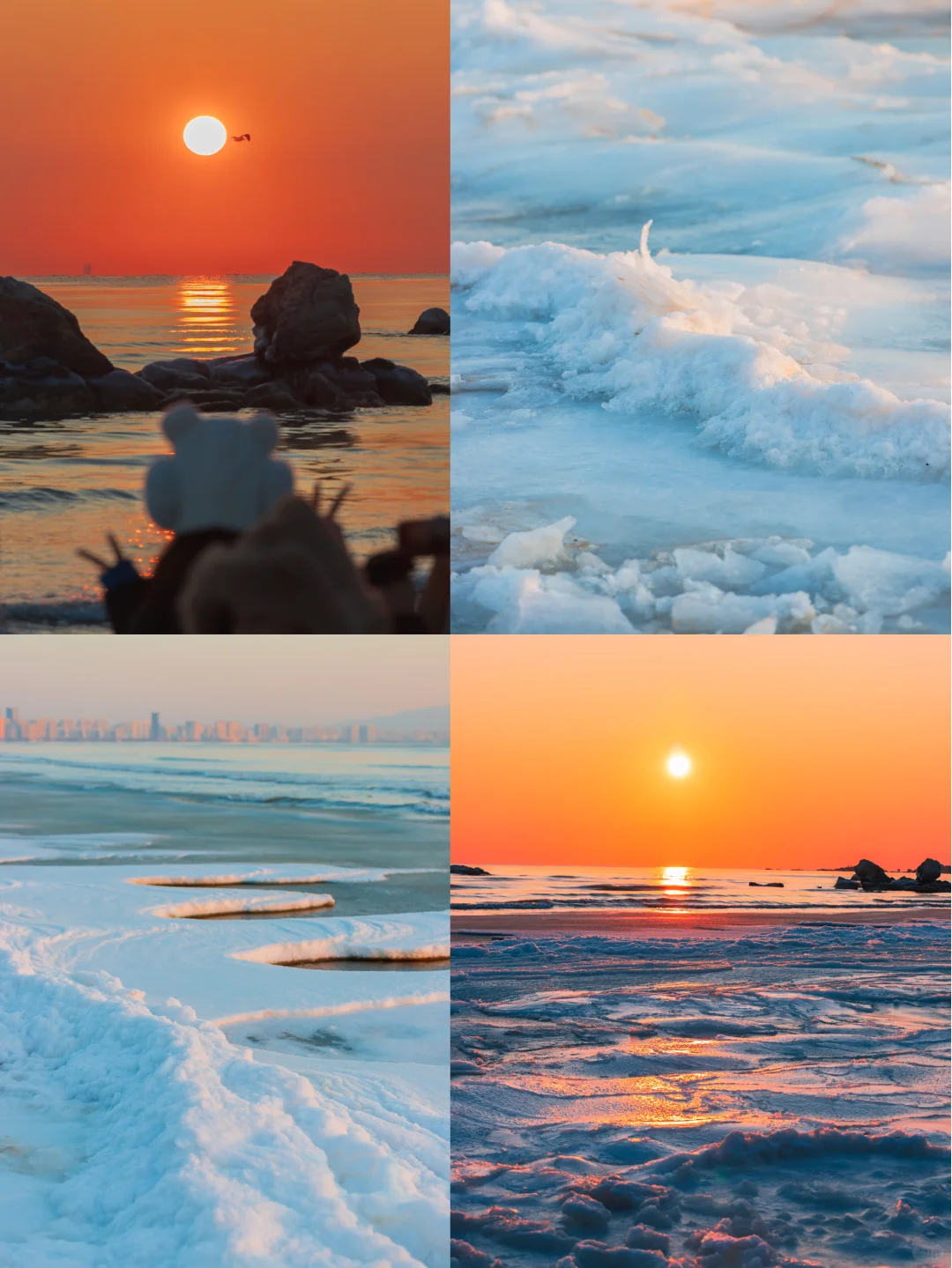 冻海是冬日海边的限定浪漫,你看过被冰封住的时间吗?鸽子窝的冻海,就藏着这样的秘密。海不再奔流。浪停在最高处,光陷进冰的裂痕。时间在这里忽然变得可见,又忽然变得缓慢。人们来了,不说话,只是站在冰原边缘。鹰角亭是鸽子窝公园最经典的日出拍摄点。这座1937年修建的亭子坐落于海边石崖顶端,占据了公园的制高点,提供了无遮挡的广阔视野。从这里向东望去,可以捕捉到太阳从海平面升起的完整过程。望海长廊连接着鹰角亭,全长70米,是另一个不容错过的拍摄位置。