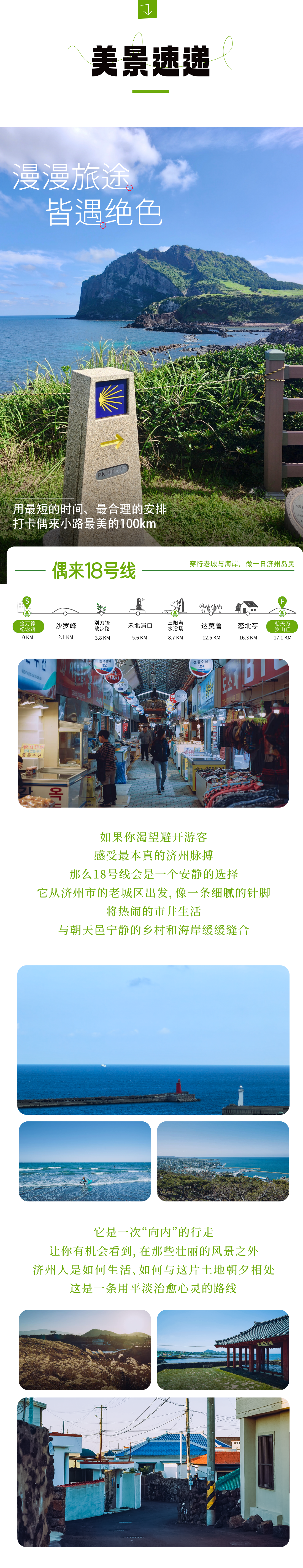 偶来小路18号线总长17.1千米,在此段路线漫步,可以邂逅济州十二美景之一的“沙峰落照”、市民体育公园、坤乙洞、华北防波堤的“诗意灯塔路”、华北环海长城以及深受济州当地居民喜欢的传统休养胜地“三阳黑沙海水浴场”。